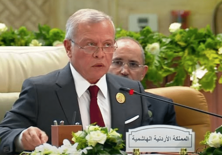 ووجه العاهل الأردنى خلال كلمته فى القمة، التحية لصمود الشعب الفلسطينى الشقيق على أرضه، وجدد وقوف الأردن إلى جانب الأشقاء الفلسطينيين فى سعيهم من أجل نيل كامل حقوقهم المشروعة، وفى مقدمتها حقهم فى الحرية والدولة المستقلة ذات السيادة على ترابهم الوطنى، على أساس حل الدولتين، فهو السبيل الوحيد لتحقيق السلام العادل والشامل الذى يضمن الأمن والاستقرار لمنطقتنا.