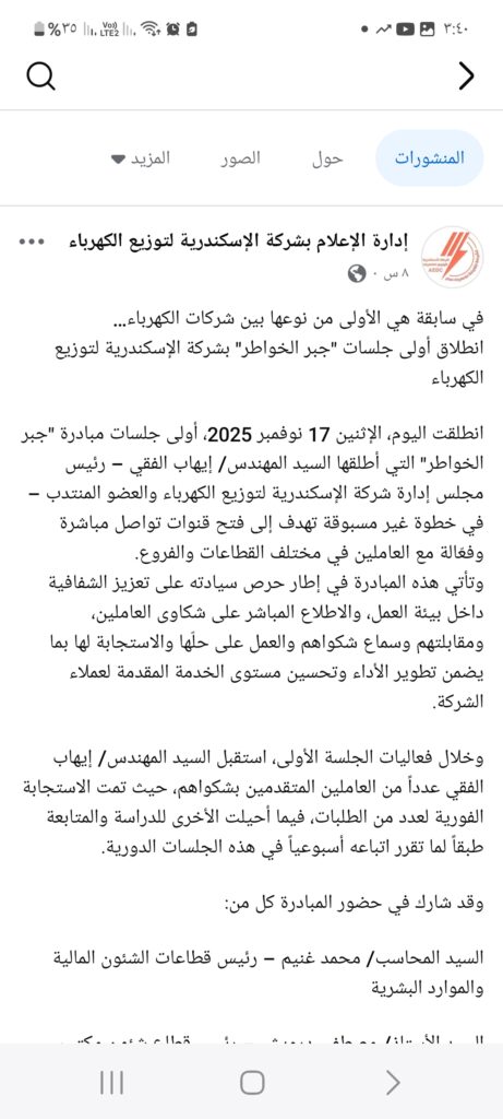 هذا العنوان الذي اختاره رئيس مجلس إدارة شركة الإسكندرية لتوزيع الكهرباء ليصف به حل مشاكل العمال ومنحهم حقوقهم ، ليس مجرد زلة لسان، بل هو فكر إداري مدمر لأي تطوير أو إصلاح ، ويجب التصدي له فورًا . إن حقوق العمال، من رواتب عادلة ، وبيئة عمل صحية ، ومستحقات متأخرة ، هي حقوق أصيلة ومكتسبة بنص القانون والدستور ، وليست هِبات أو صدقات تُمنح تحت مسمى “جبر الخواطر” متى سمح به رئيس مجلس الإدارة ، أو وافق مزاجه الإداري ، أو كان تأثرا لخطبة جميلة ، فأراد أن يمتن بمعروف على العمال والموظفين .