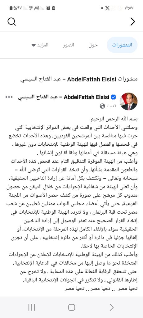 وقال الرئيس السيسي عبر حسابه الرسمي على “فيس بوك”:” “وصلتني الأحداث التي وقعت في بعض الدوائر الانتخابية التي جرت فيها منافسة بين المرشحين الفرديين، وهذه الأحداث تخضع في فحصها والفصل فيها للهيئة الوطنية للانتخابات دون غيرها، وهي هيئة مستقلة في أعمالها وفقا لقانون إنشائها”.