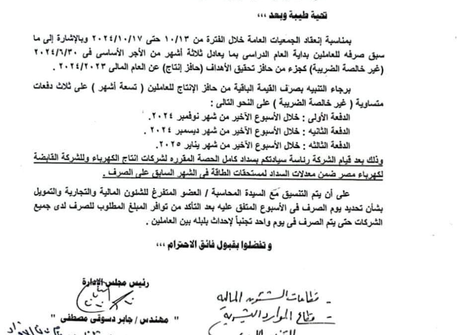 حصلت” القاهرة اليوم” على نص القرار الذي اصدرته الشركة القابضة لكهرباء مصر، والذي يتضمن صرف 9 أشهر حافز الإنتاج للعاملين في الشركة القابضة والشركات التابعة على 3 دفعات وهي كالتالي: