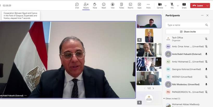 التقى السفير نبيل حبشى نائب وزير الخارجية للهجرة وشئون المصريين بالخارج عبر الفيديو كونفرانس، مع نائب وزير الخارجية اليونانى جورجيوس كوتسيراس، والسفيرة ثيودورا كونستانتنيدو رئيس خدمة القبارصة فى الخارج والعائدين للوطن، بحضور سفير مصر فى اليونان عمر عامر وسفير مصر فى قبرص محمد زعزوع والسفير اليونانى بالقاهرة نيكولاوس بابا جيورجيو ، لبحث التعاون المشترك فى مجال المغتربين، وعلى نحو يشمل المبادرة الرئاسية “احياء الجذور – NOSTOS”.