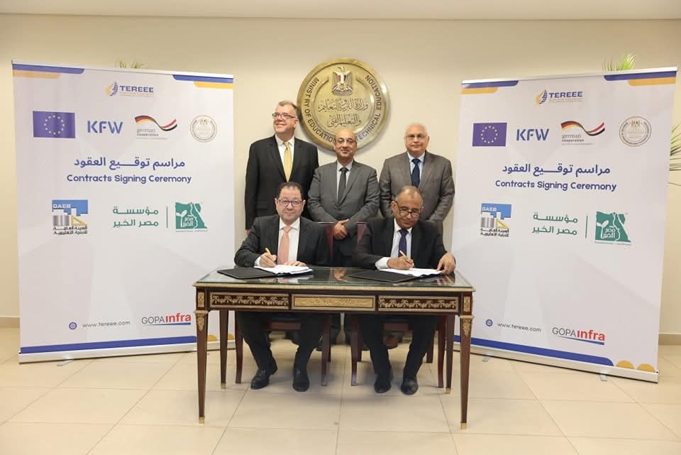 وقعت وزارة التربية والتعليم والتعليم الفني، ومؤسسة مصر الخير، عقود التصميم المعماري لإنشاء مركزي تميز في الطاقة المتجددة، وكفاءة الطاقة في محافظتي المنيا وأسوان، وعقود أعمال البناء والتأهيل لمدرستين ثانويتين، فنيتين وذلك فى إطار عمل أنشطة مشروع “تعزيز التعليم الفني والتدريب المهني لقطاع الطاقة الجديدة والمتجددة”، بالتعاون مع بنك التعمير الألماني.