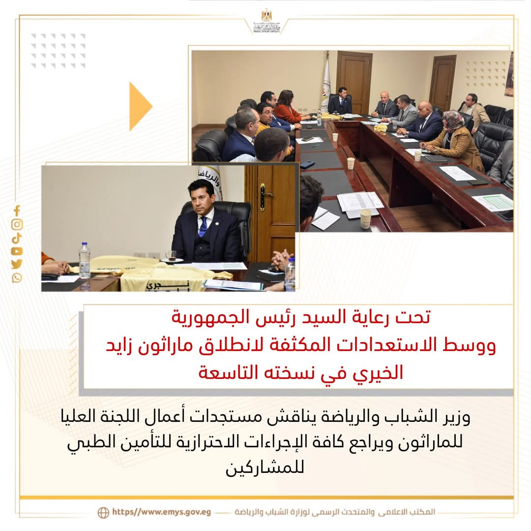 عقد الدكتور أشرف صبحي وزير الشباب والرياضة، اجتماعاً موسعاً مع اللجنة العليا لماراثون زايد الخيري، لمناقشة مستجدات أعمال اللجنة، بحضور الشركة المنظمة والمسئولين عن اللجنه الطبية بالأمانة العامة لمجلس الوزراء لمراجعه كافة الإجراءات الاحترازية للتأمين الطبي للمشاركين بالنسخة التاسعة من الماراثون والتي تنطلق ٢٧ ديسمبر الجاري، تحت رعاية السيد رئيس الجمهورية.